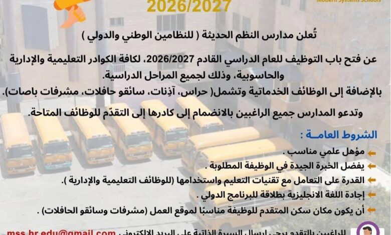 تعلن مدارس النظم الحديثة عن فتح باب التوظيف للعام الدراسي 2026/2027
