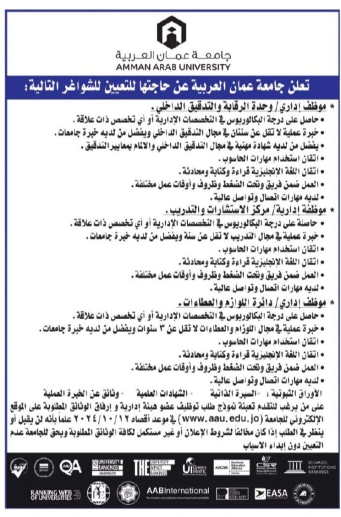 تعلن جامعة عمان العربية عن حاجتها لملئ عدد من الوظائف الإدارية